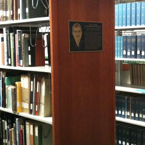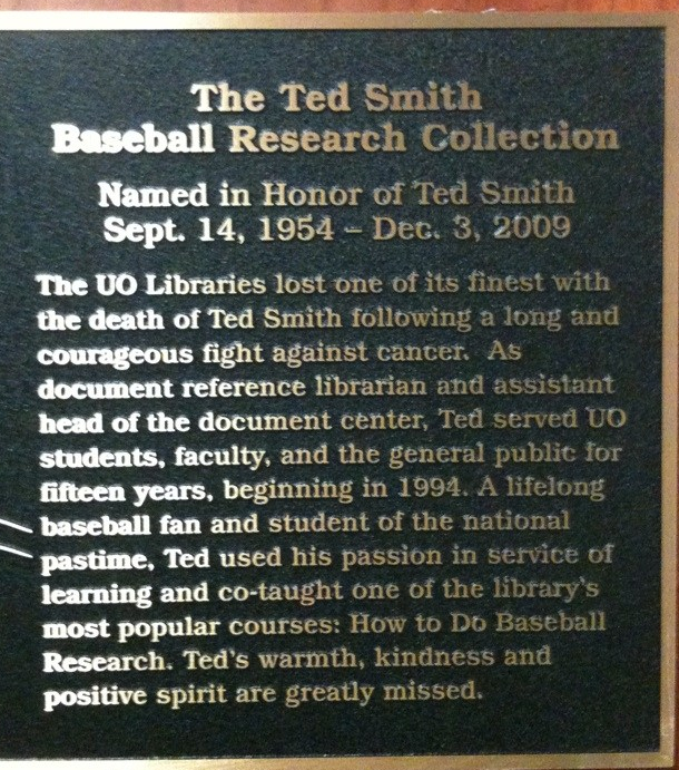 As a tribute to Ted, another librarian, Paul Frantz, and I took over the planning for the exhibit and even made a road trip to Helena, MT to collect some Jackie Robinson memorabilia that author and baseball aficionado Craig Wight generously lent to us for the event. We also taught the baseball research course in 2011 and again in 2013, and savored the privilege of having Ted’s youngest son, Trevor, take the class in his freshman year at the UO. Finally, Paul and I worked with several other colleagues to celebrate Ted’s legacy by naming the library’s baseball collection in his honor. A plaque was designed and mounted in the library stacks and a gift fund was set up in Ted’s name to facilitate the ongoing development of the collection. On December 22, we held a dedication ceremony with Ted’s wife Kathy and his two sons in attendance.
